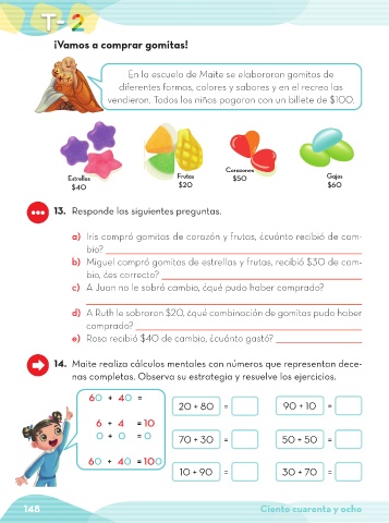 a) Iris compró gomitas de corazón y frutas, ¿cuánto recibió de cam-