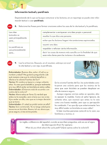 9. Lee la entrevista. Después, en el resumen, subraya con azul