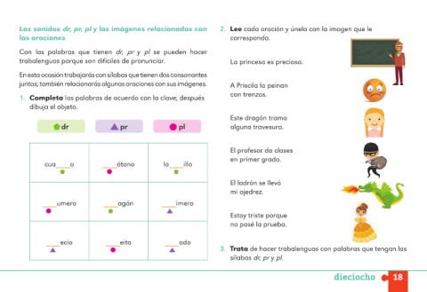 Los sonidos dr, pr, pl y las imágenes relacionadas con 2. Lee cada oración y únela con la imagen que le
