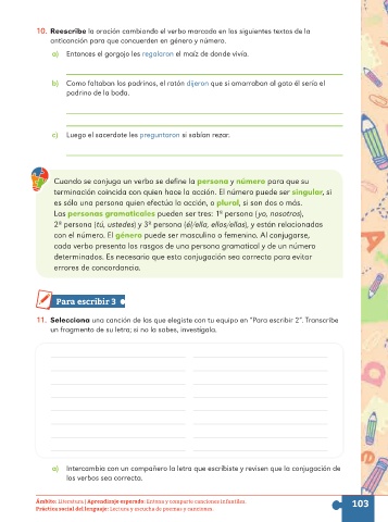 a) Intercambia con un compañero la letra que escribiste y revisen que la conjugación de