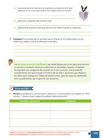Ámbito: Participación social | Aprendizaje esperado: Elabora avisos para difundir algún producto o servicio. 145
