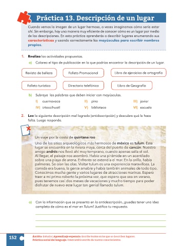 152 Ámbito: Estudio | Aprendizaje esperado: Escribe textos en los que se describen lugares.