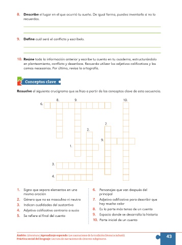 4. Adjetivo calificativo contrario a sucio 8. Es la parte más tensa de un cuento