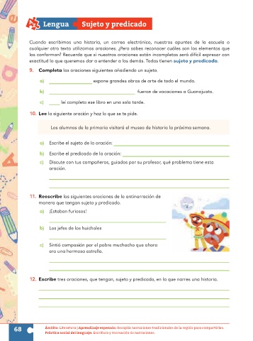 12. Escribe tres oraciones, que tengan, sujeto y predicado, en la que narres una historia.