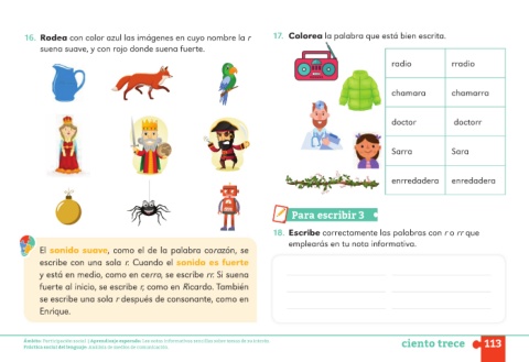 16. Rodea con color azul las imágenes en cuyo nombre la r 17. Colorea la palabra que está bien escrita.