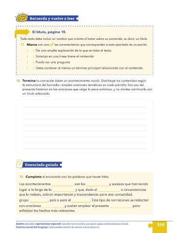 Ámbito: Estudio | Aprendizaje esperado: Escribe textos en los que narre algún acontecimiento social. 159