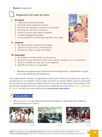 Ámbito: Participación social | Aprendizaje esperado: Participa en la elaboración de un reglamento escolar. 79
