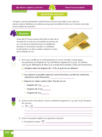 2. ¿Cómo le dan más dinero a Laura, vendiendo lingotes de 1 g o de 2.5 g? Compara